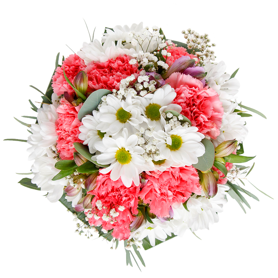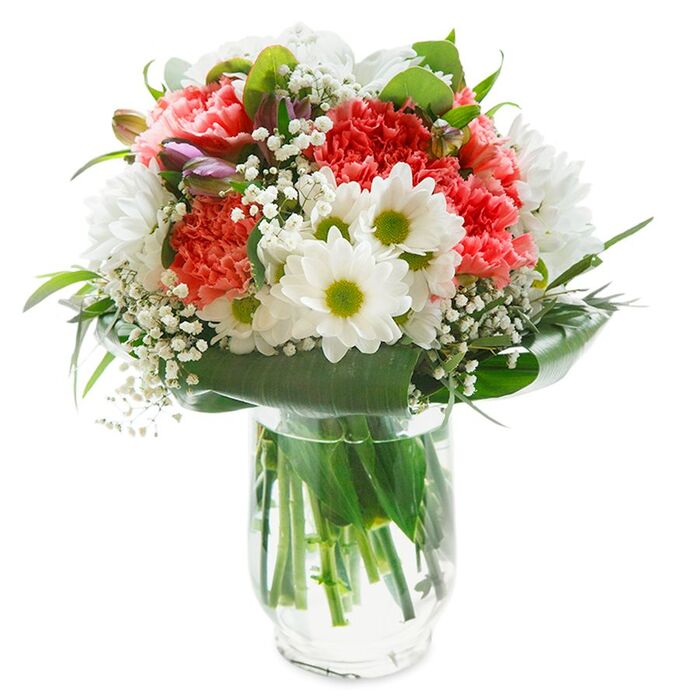Delight someone special with our beautifully crafted bouquet, designed to bring joy and elegance to any occasion. This arrangement features a harmonious blend of snow-white chrysanthemums, delicate gypsophila, soft light pink carnations, and lush aspidistra leaves, creating a stunning visual appeal.